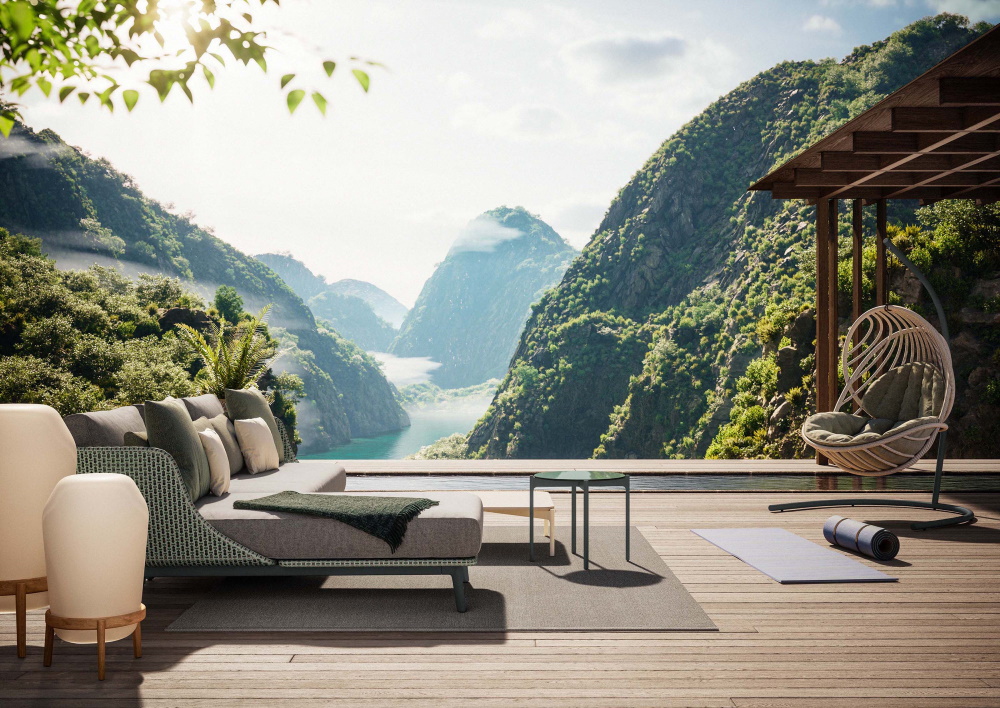 Luxuriöse Outdoor-Lounge mit Sofa, Hängesessel, Yogamatte und Bergblick für entspannte Momente im Freien.