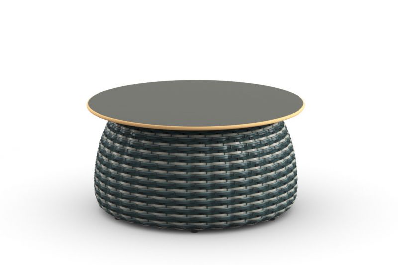 Dedon Porcini Beistelltisch mit runder, grauer Tischplatte und geflochtenem Untergestell für den Außenbereich.