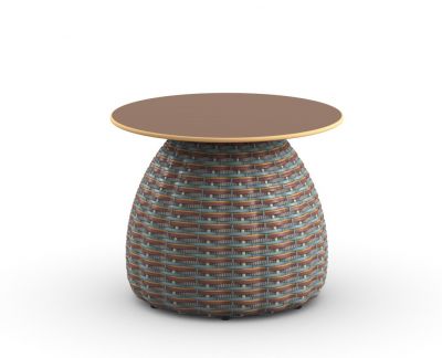 Dedon Porcini Beistelltisch: Runder Outdoor-Tisch mit brauner Tischplatte und geflochtenem Untergestell.