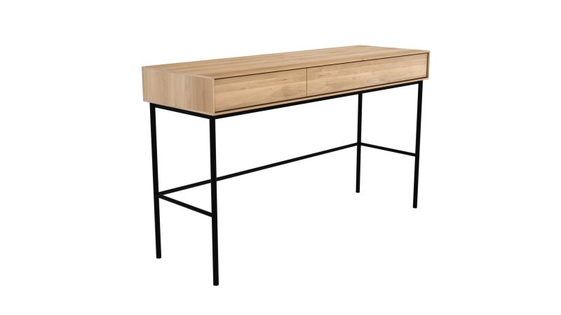 Blackbird Schreibtisch aus Eiche von Ethnicraft mit zwei Schubladen und schwarzen Metallbeinen.