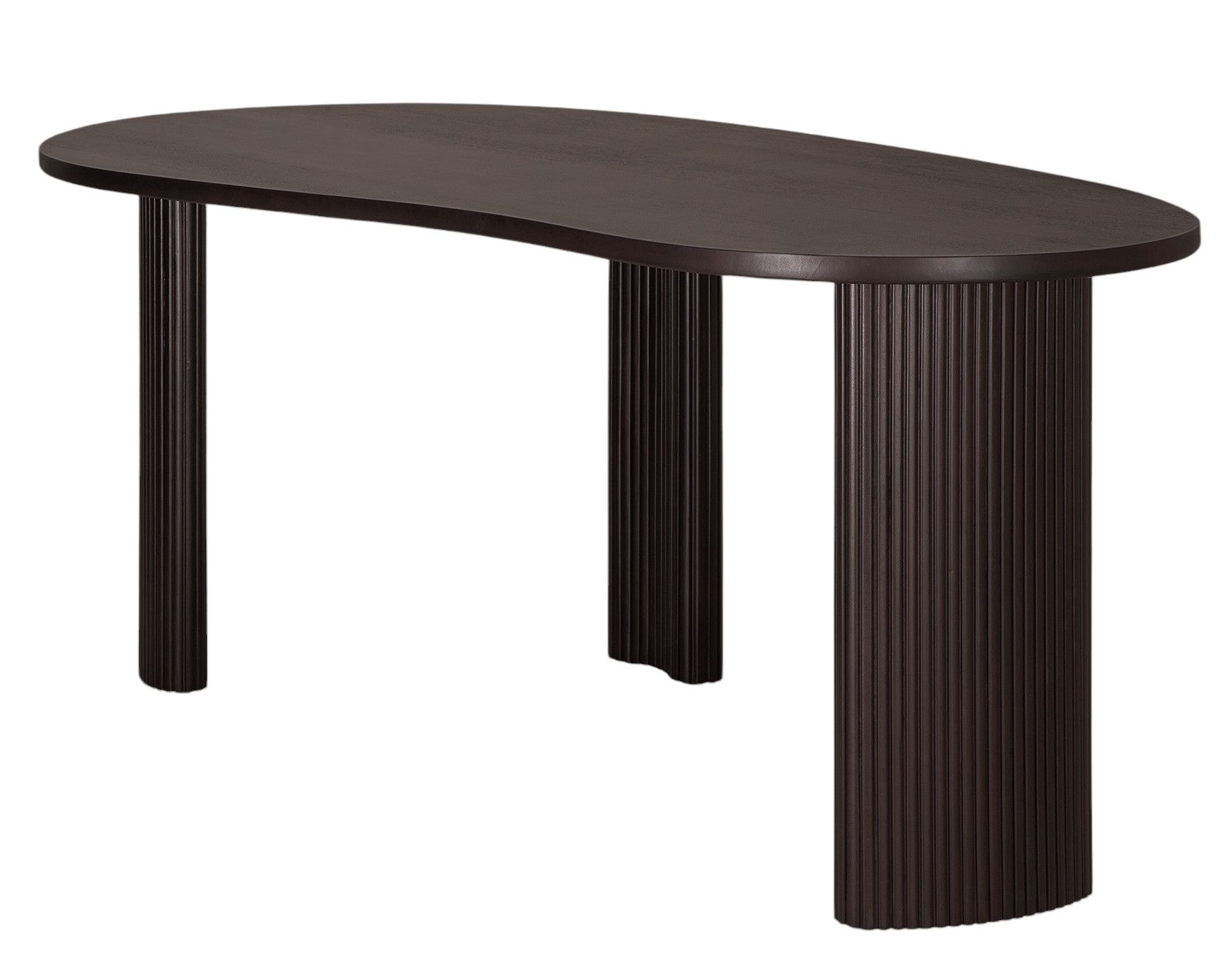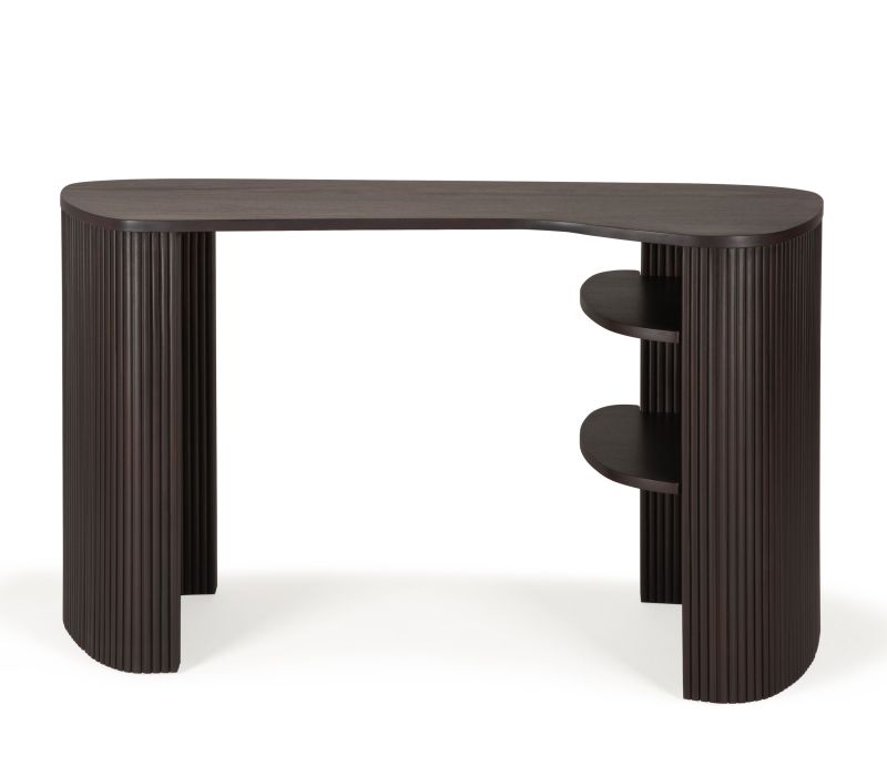 Ethnicraft Schreibtisch Boomerang aus dunklem Holz mit geriffelten Beinen, modernes Design für Büro und Arbeitszimmer.