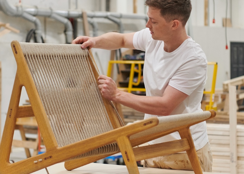 Bei den verschiedenen Produkten von Gubi wird nicht nur auf die Qualität der Materialien geachtet, sondern einiges in traditioneller Handwerkskunst gefertigt. Beispielsweise kommt der MR01 Initial Chair Sessel ganz ohne Schrauben aus, sondern wird mit handwerklichen Tischlertechniken wie Keilzinkenverbindungen gefertigt. Zudem wird auf die Verwendung natürlicher Materialien gesetzt. Die Sitz- und Rückenlehne des MR01 besteht zum Beispiel aus einer 90 meterlangen Leinenschnur, welche handgeflochten wird.