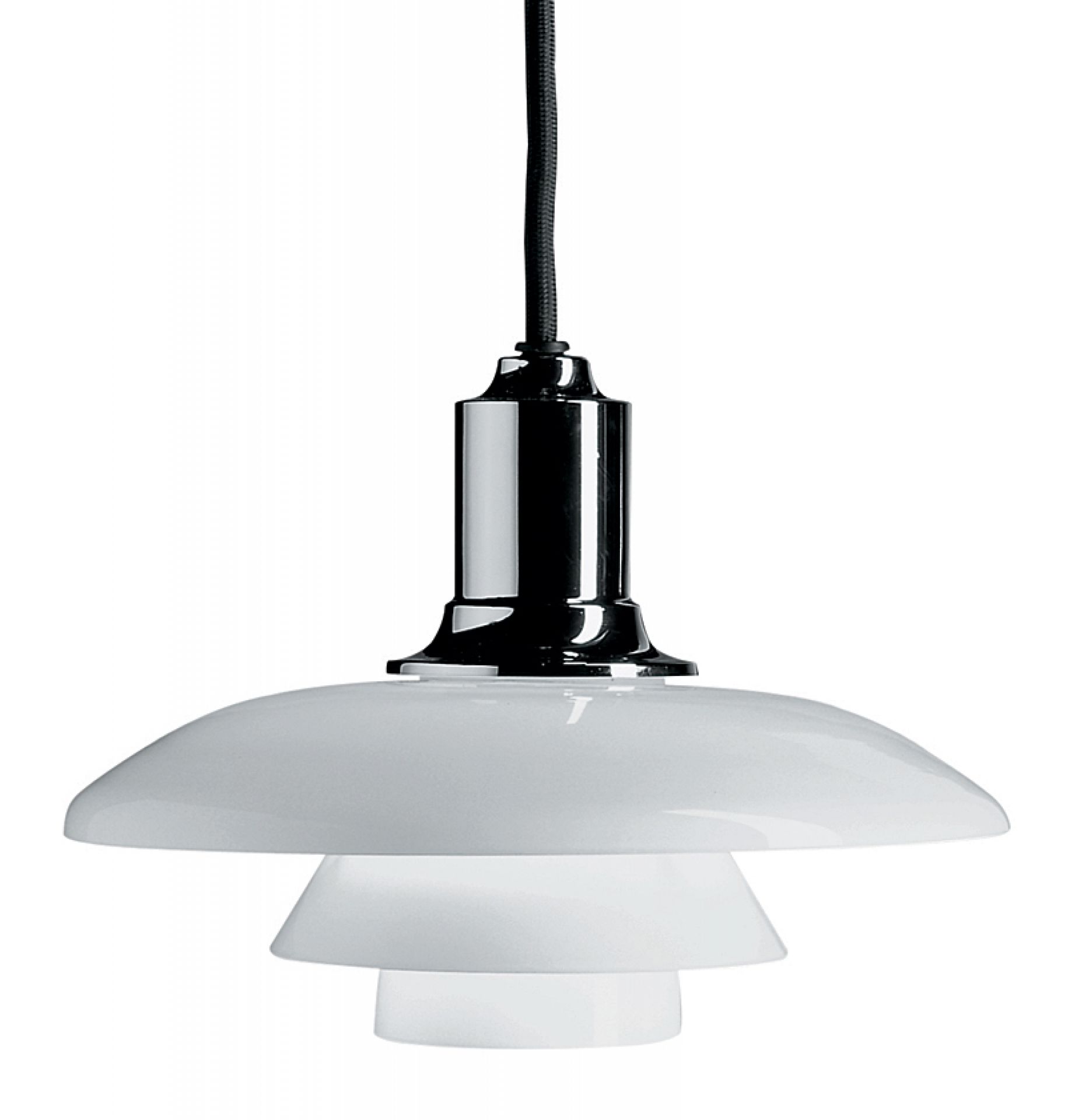 PH 2/1 Pendelleuchte von Louis Poulsen: Elegante Hängelampe mit drei Schirmen und Chrom-Aufhängung.