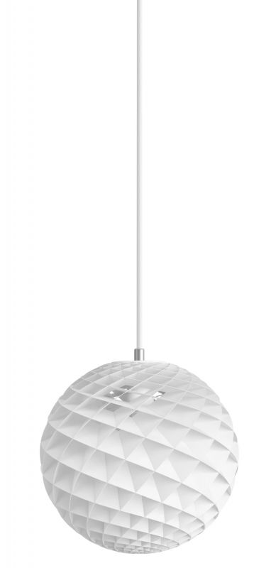 Weiße Patera Pendelleuchte von Louis Poulsen, kugelförmig mit Rautenmuster, moderne Deckenleuchte.