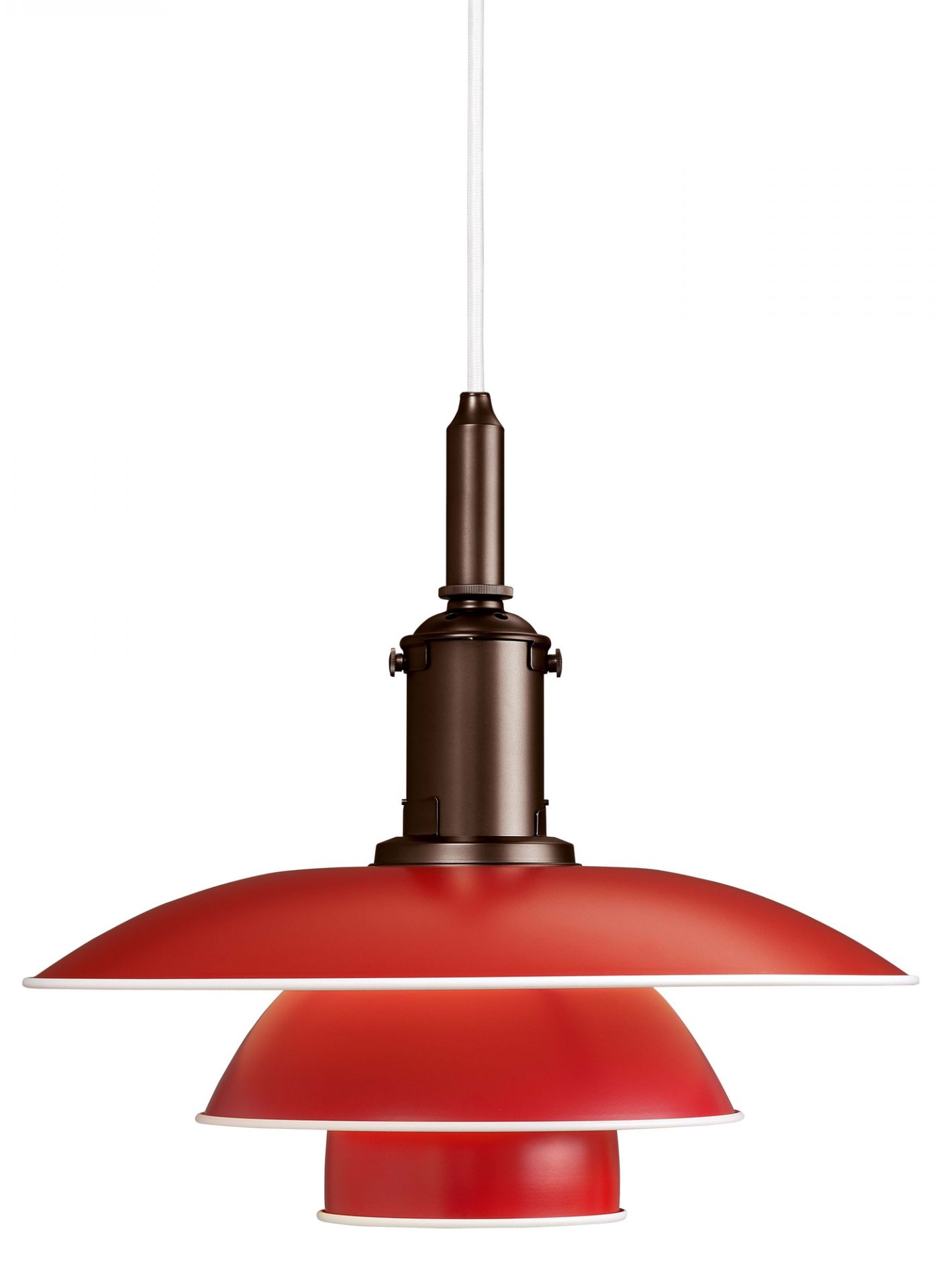 Rote PH 3 1/2-3 Hängeleuchte von Louis Poulsen mit drei Schirmen für blendfreies Licht.