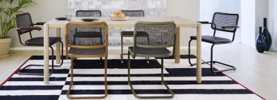 Die bekannten Klassiker aus Bugholz, wie der 214 Kaffeehausstuhl und aus Stahlrohr, wie der S32 Freischwinger werden stetig in neuen Editionen weiterentwickelt und bleiben so immer am Puls der Zeit. Dazu arbeitet Thonet mit zahlreichen namhaften nationalen und internationalen Designern zusammen.