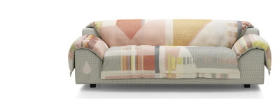 Vitra Dumet Stoffmusterkarte: Nahaufnahme verschiedener Stoffmuster in Beige, Grau, Gelb und Rosé.