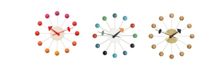 Mehrfarbige Ball Clock Wanduhr von Vitra mit bunten Kugeln und goldenen Streben.