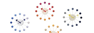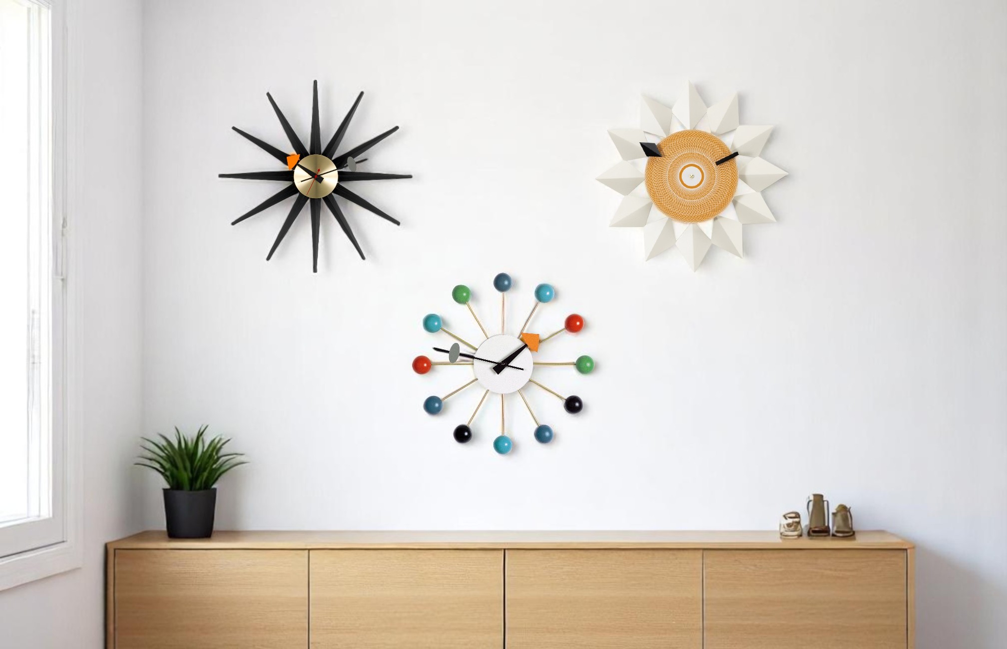 Drei moderne Wanduhren im Mid-Century-Design: Atomuhr, Sternuhr und Sonnenuhr als Wohnaccessoires.