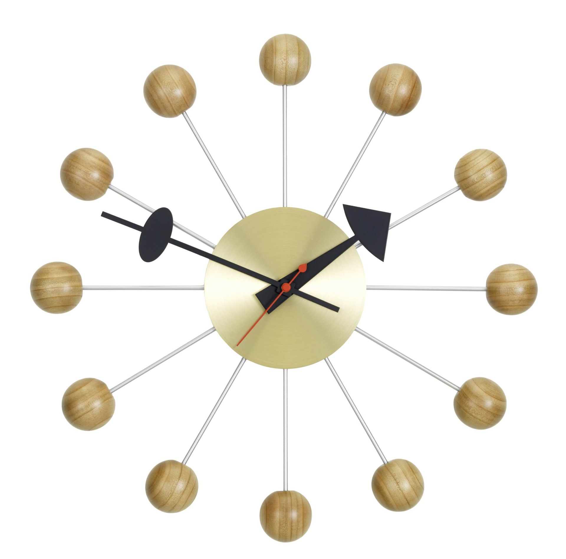 Vitra Ball Clock Wanduhr aus Buchenholz natur mit goldenen Streben und schwarzen Zeigern.