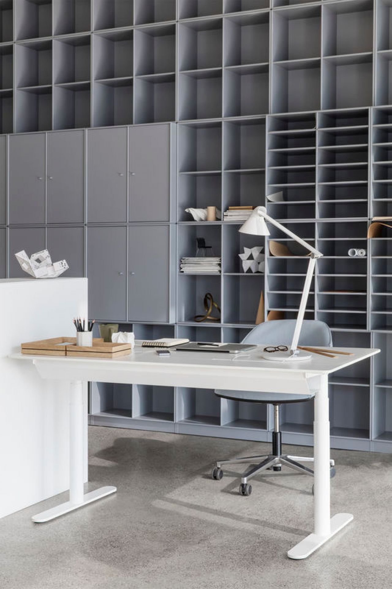 Arbeiten in einer funktionalen und aufgeräumten Arbeitsumgebung: Dies gelingt mit dem HiLow 2 Tisch, einem höhenverstellbaren Designer Schreibtisch von Montana.