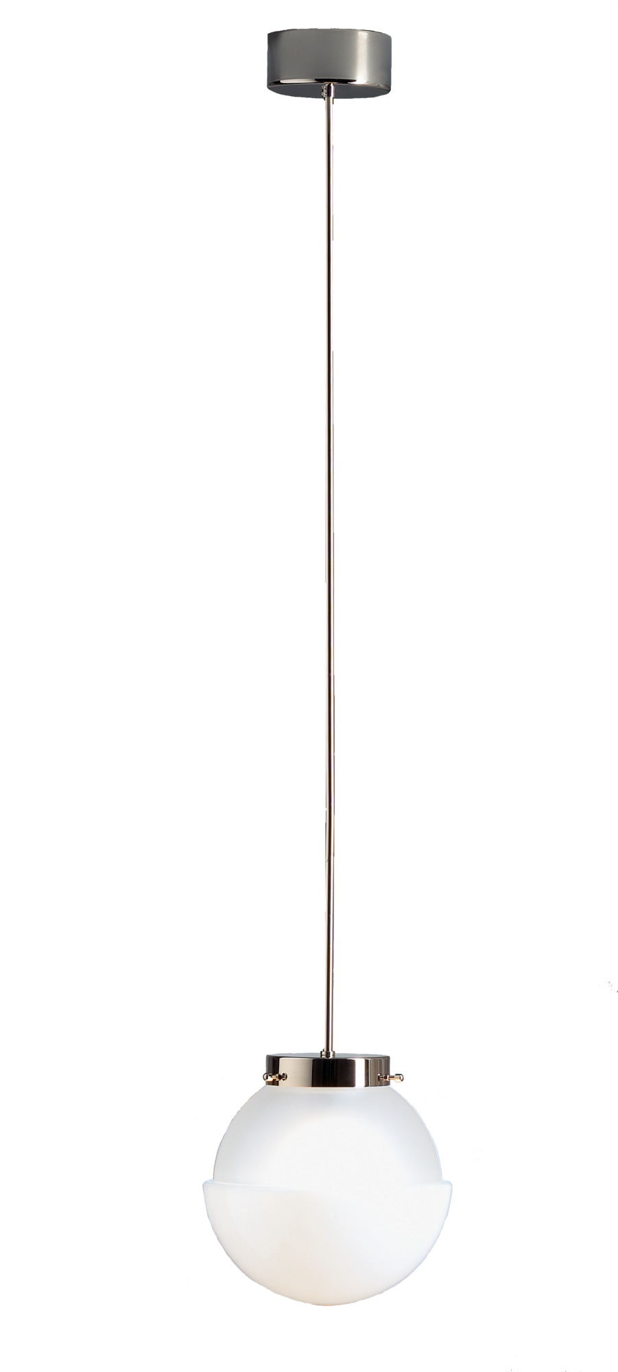 Die einzige Frau, die in der Metallwerkstatt des Bauhauses gearbeitet hat, Marianne Brandt, hat dieses Design entwickelt. Die Pendelleuchte von Tecnolumen zeichnet sich durch eine große und zur Hälfte opalüberfangene Glaskugel aus. Der Entwurf stammt von 1928/29.