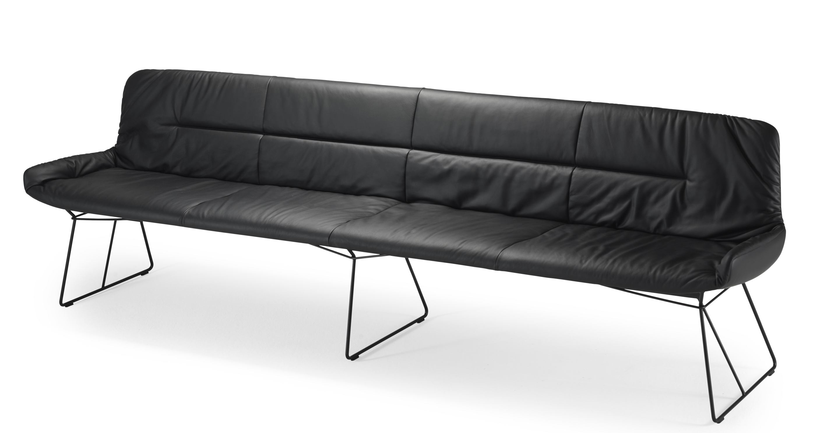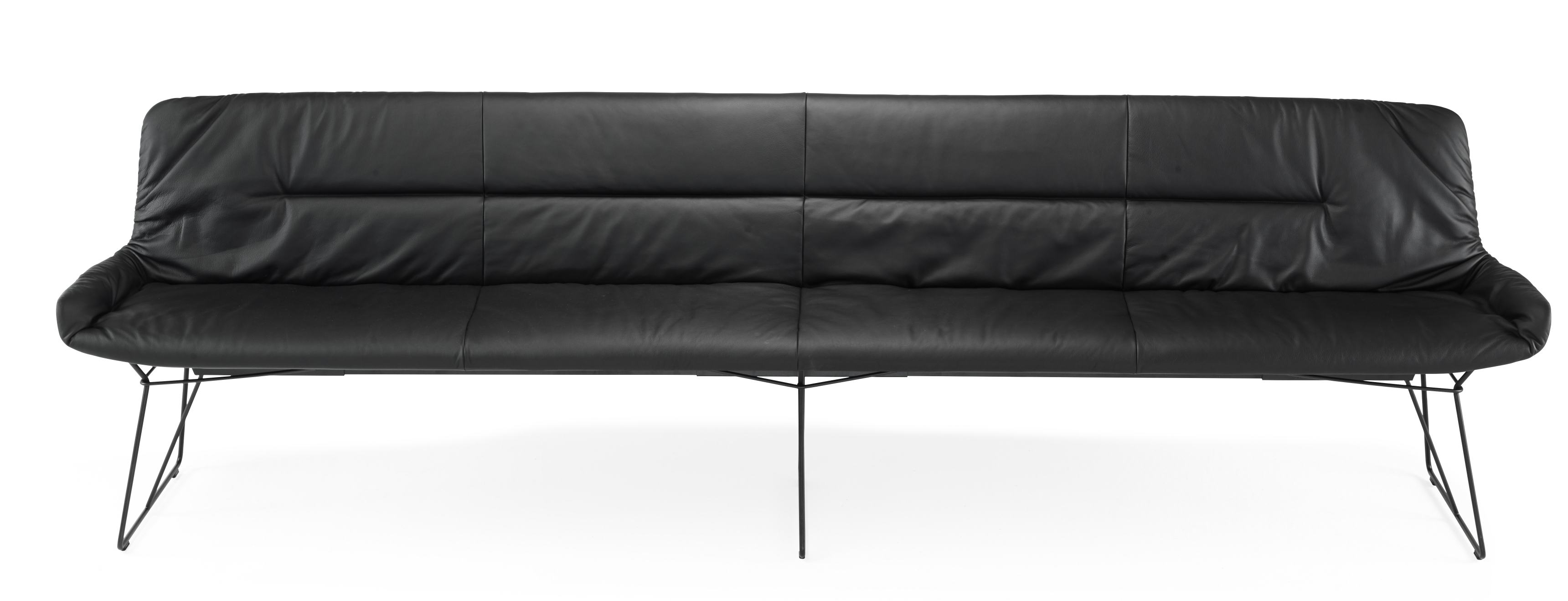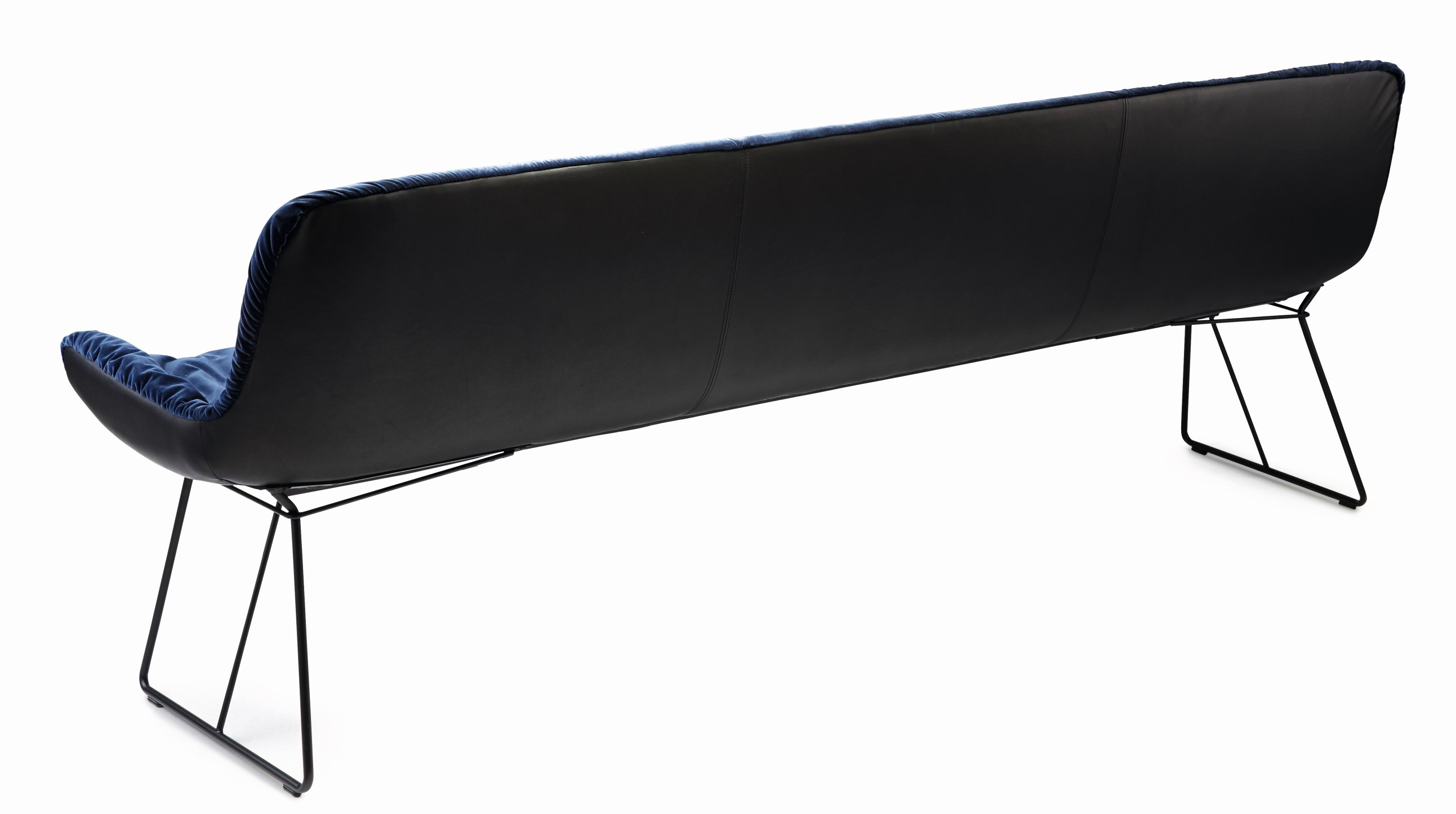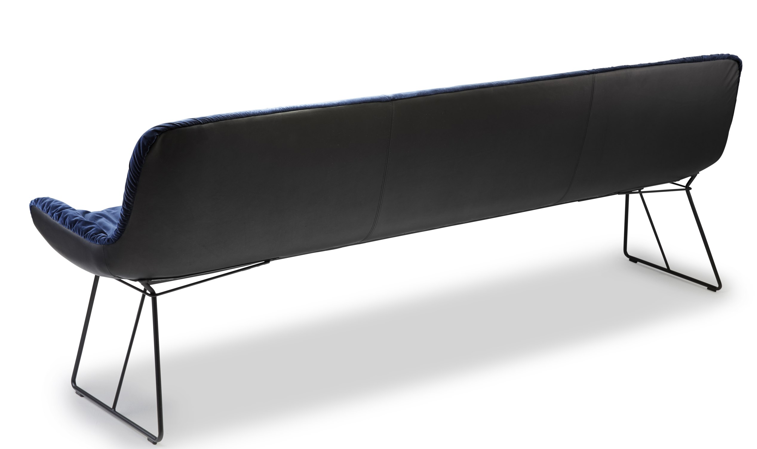 Leya ist 85 cm hoch, 160 cm breit und 57 cm tief – bei einer Sitzhöhe von 47 cm. Die Höhe der Armlehne ist 53 cm. Sie verfügt über ein schwarzes Drahtgestell und kann mit verschiedenen Leder/Stoffbezügen gewählt werden: