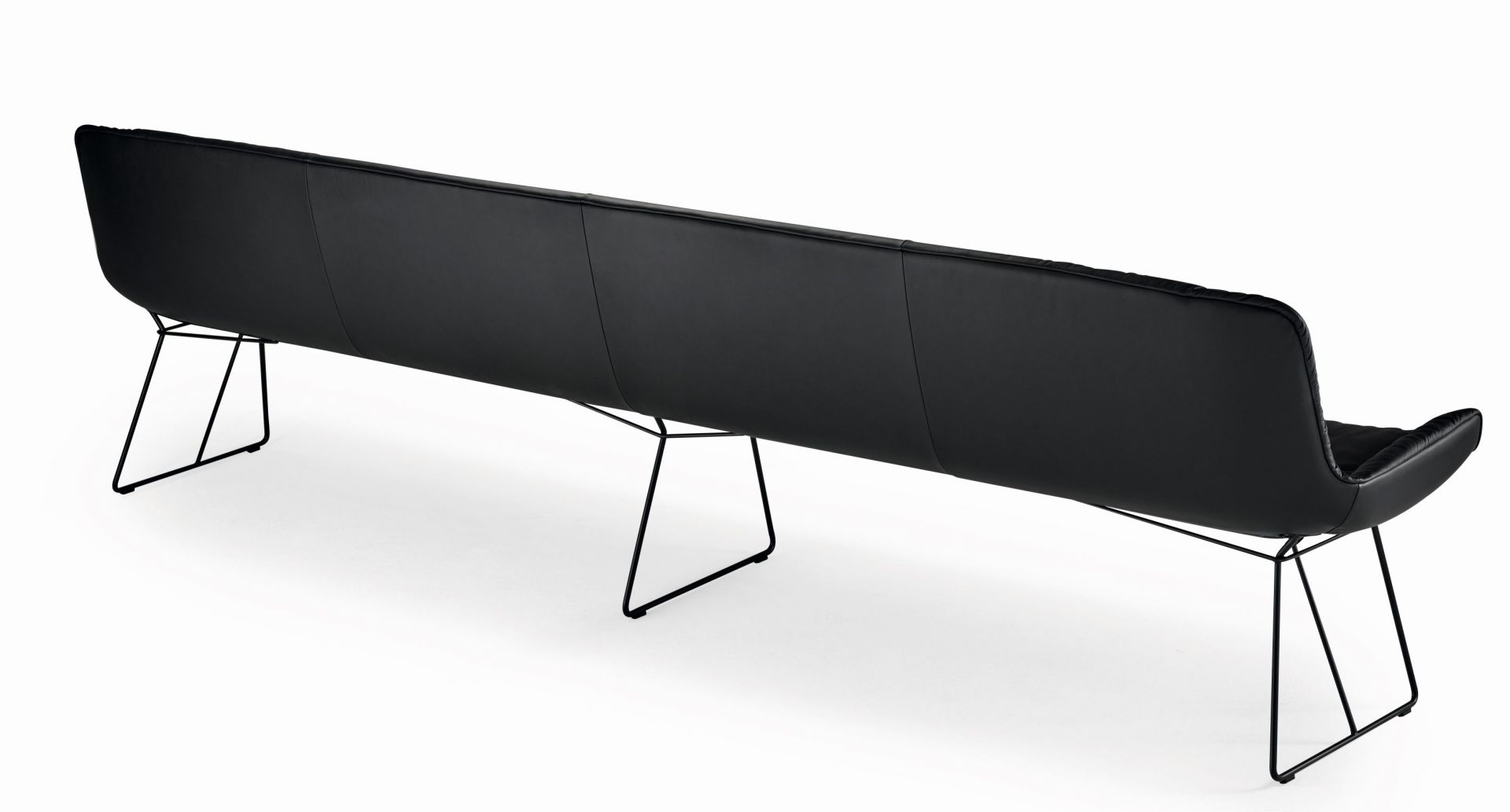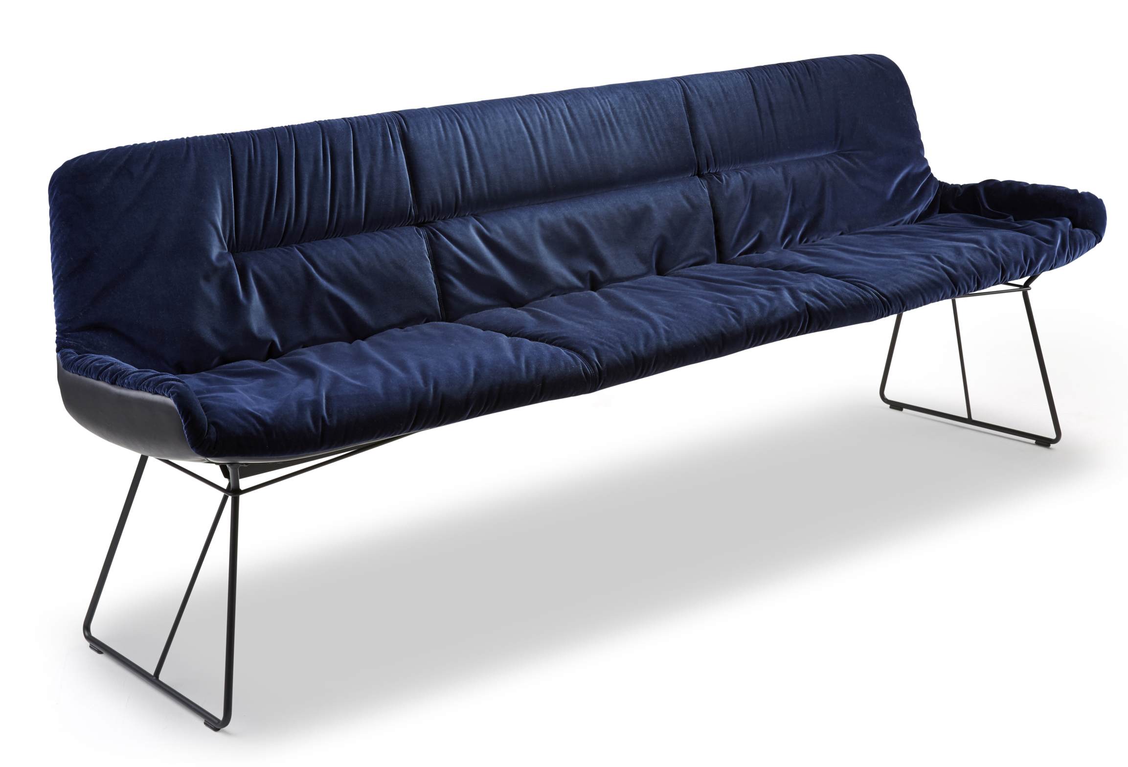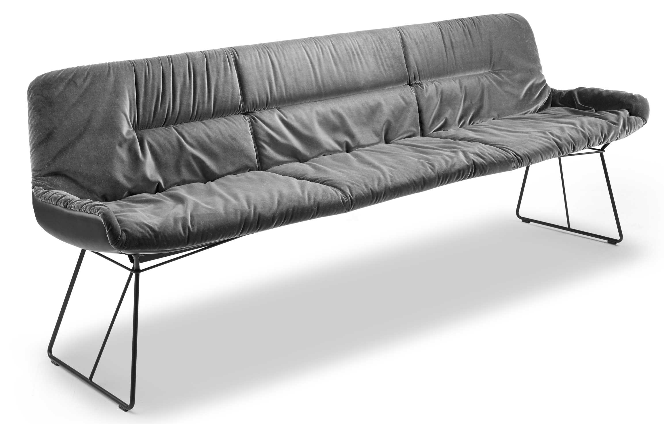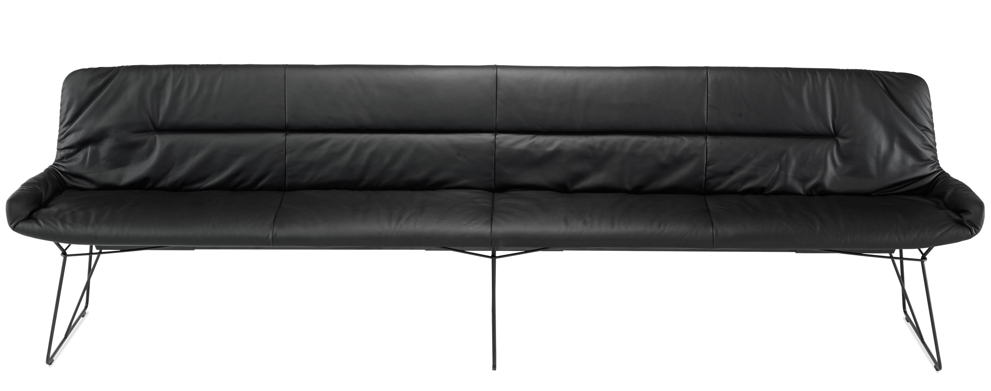 Leya ist 85 cm hoch, 160 cm breit und 57 cm tief – bei einer Sitzhöhe von 47 cm. Die Höhe der Armlehne ist 53 cm. Sie verfügt über ein schwarzes Drahtgestell und kann mit verschiedenen Leder/Stoffbezügen gewählt werden: