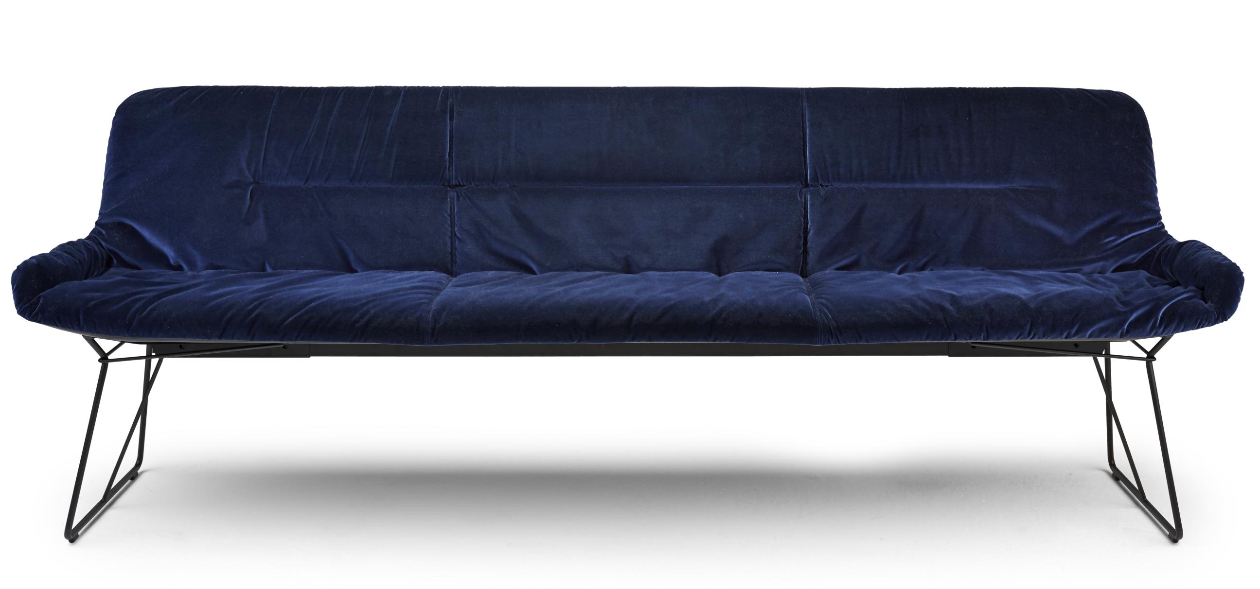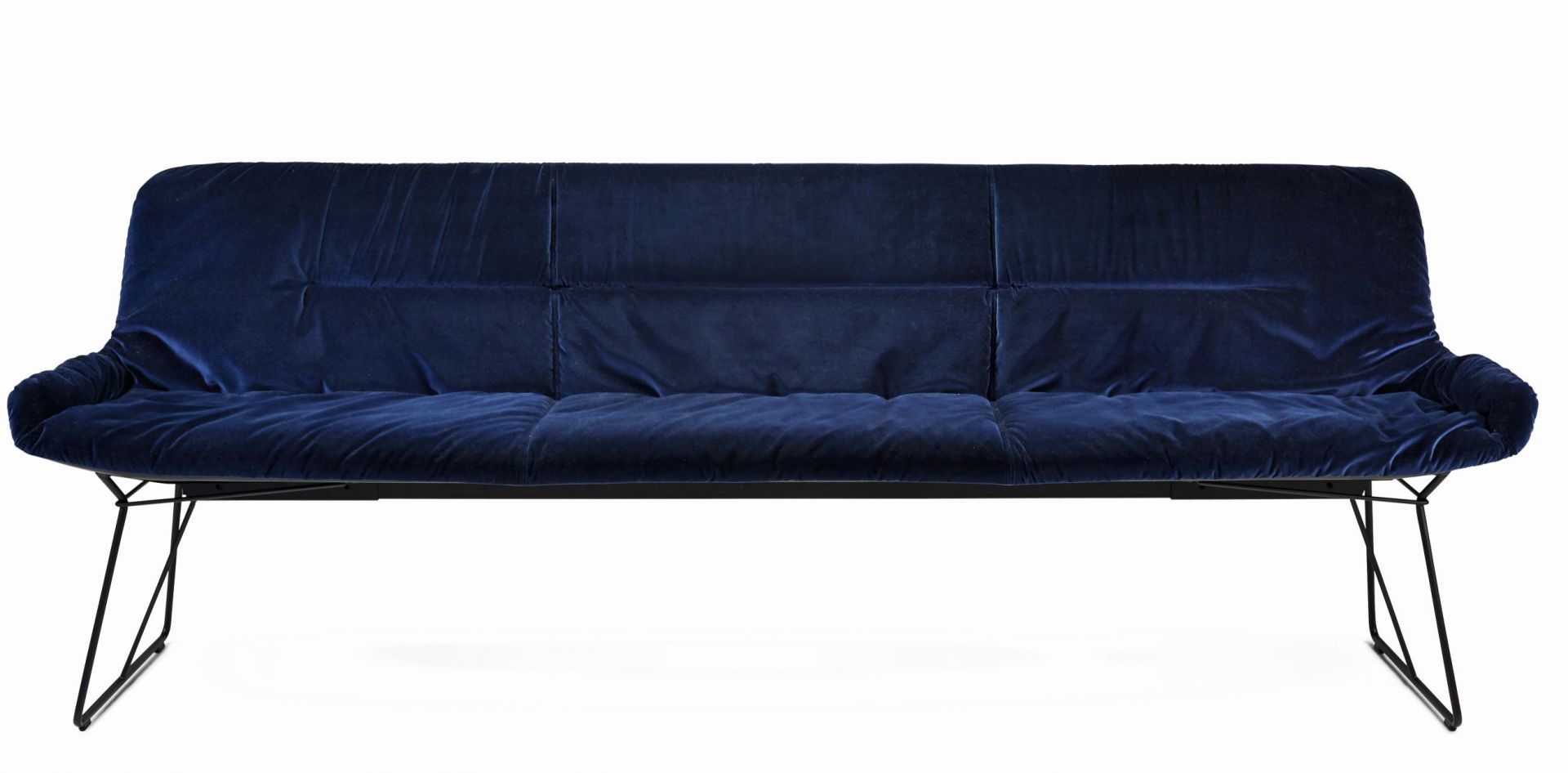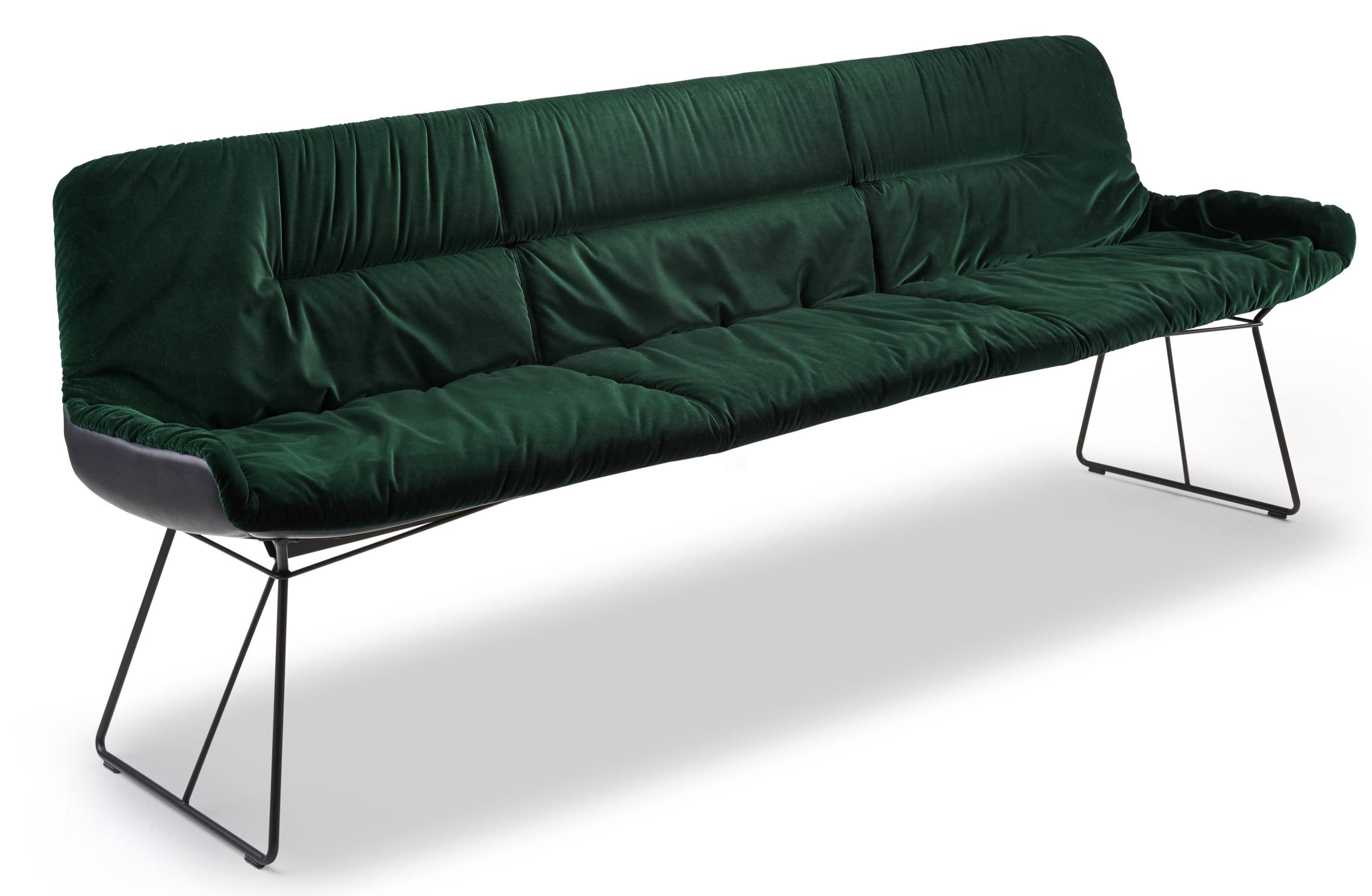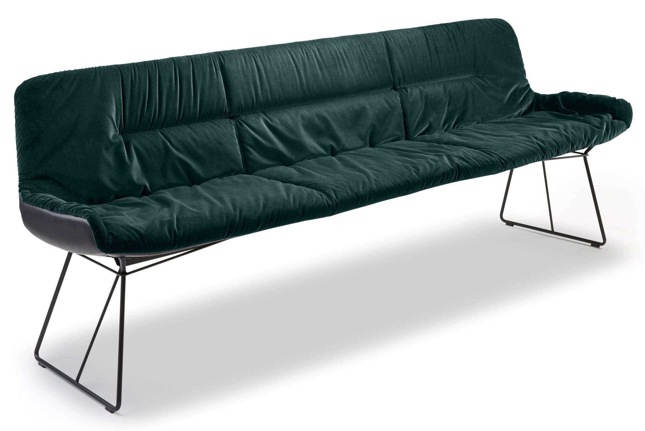 Leya ist 85 cm hoch, 160 cm breit und 57 cm tief – bei einer Sitzhöhe von 47 cm. Die Höhe der Armlehne ist 53 cm. Sie verfügt über ein schwarzes Drahtgestell und kann mit verschiedenen Leder/Stoffbezügen gewählt werden: