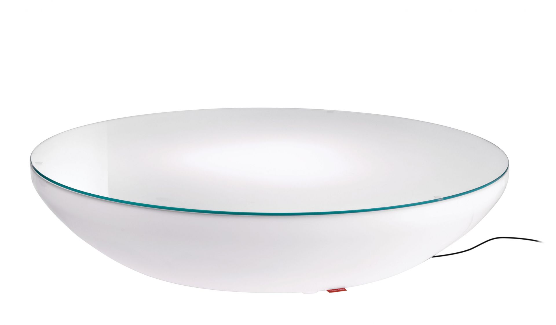 Der Lounge Variation Beistelltisch besteht aus UV beständigem und PMMA beschichtetem ABS. Er misst 84 cm im Durchmesser und ist 18 cm hoch.