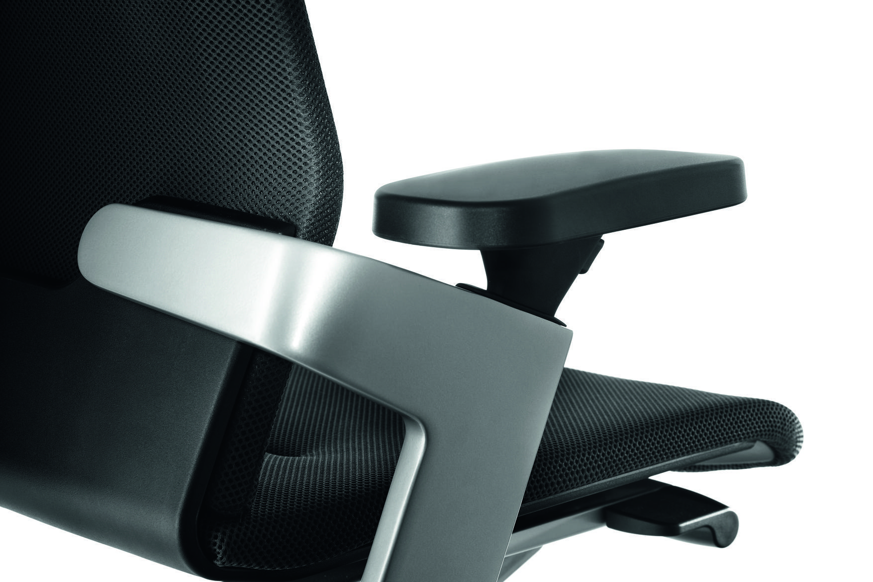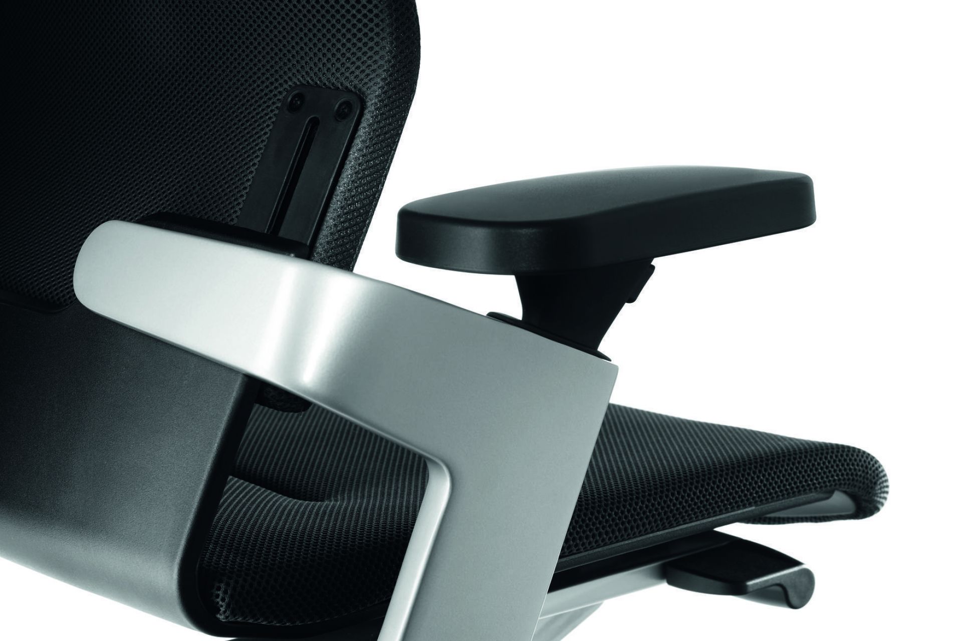 3-D-Armlehne aus glasfaserverstärktem, schwarzen Polyamid mit Armauflagen, wahlweise in Leder. Die Armlehnen sind in der Höhe um 10 cm (acht Rasterpositionen), in der Tiefe um 4 cm einstellbar, jeweils um 30 Grad nach innen und außen schwenkbar.