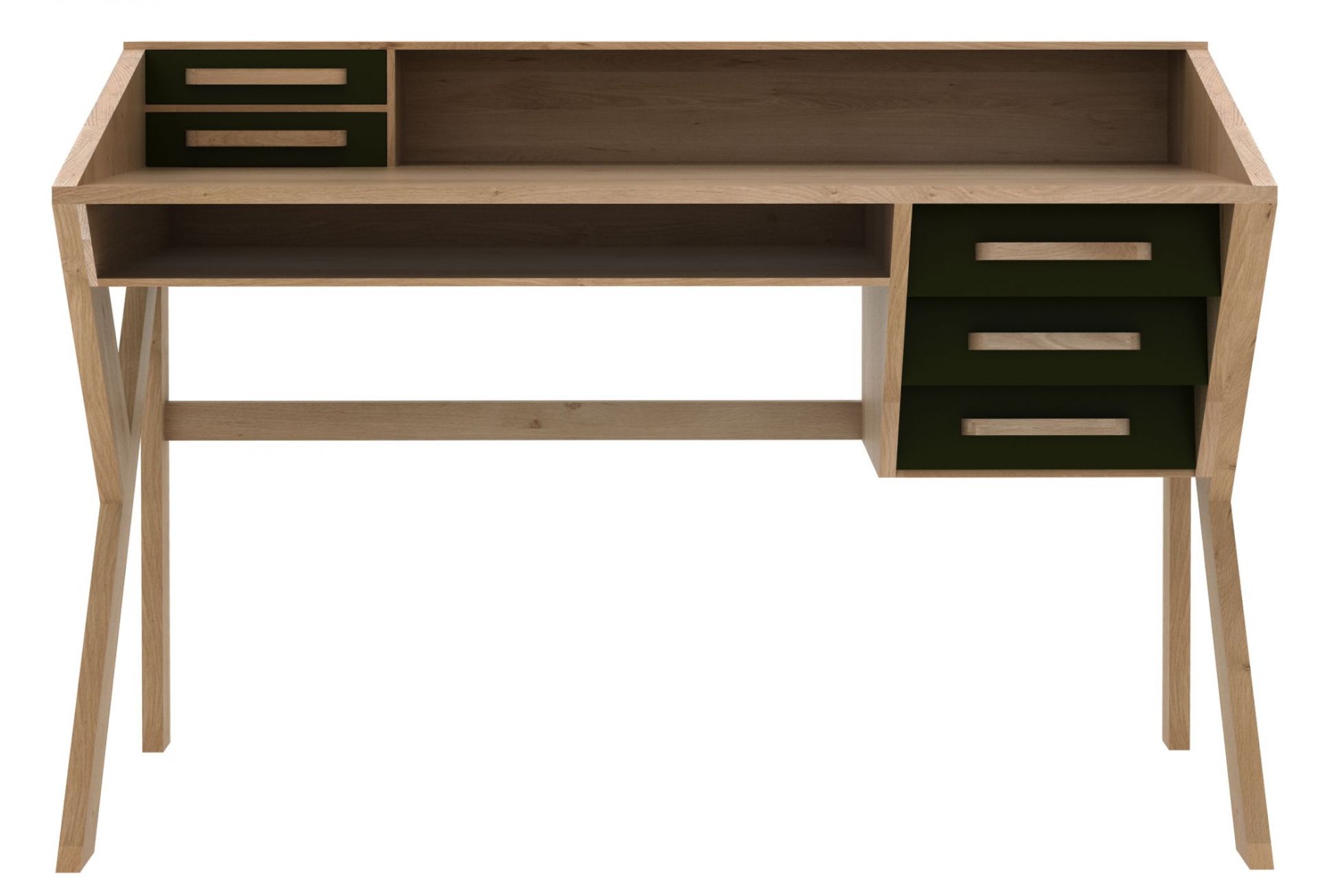 Der Origami Schreibtisch aus massivem Eichenholz mit Hartwachs-Öl-Finish glänzt mit fünf praktischen Schubladen in Schwarz oder Creme und einem offenen Ablagefach.