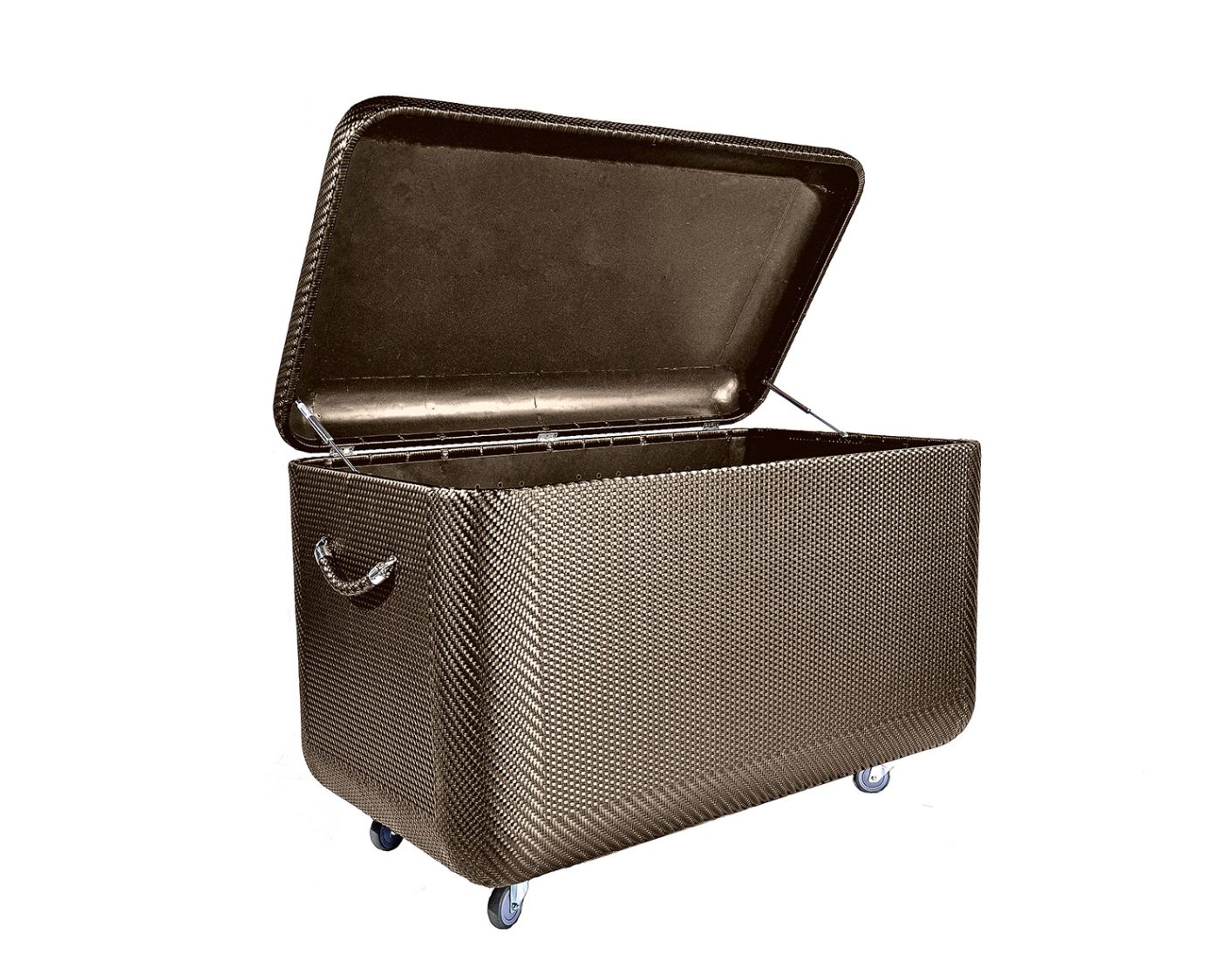 Geöffnete La Malle Kissentruhe XL von Dedon in Braun, mit Rollen und Tragegriffen.