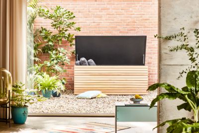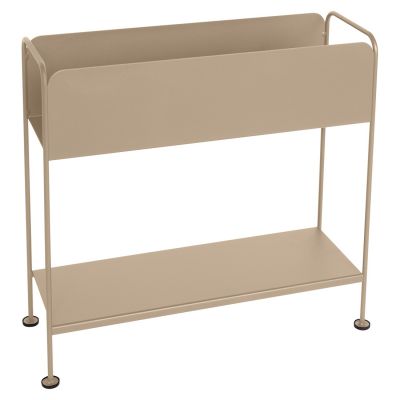 Rechteckiger Combine Pflanzengefäß von Cane-Line mit Holzverkleidung und schwarzem Metallgestell für den Außenbereich.