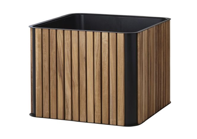Quadratischer Cane-Line Pflanzenkübel aus Teakholz und schwarzem Metall, ideal für Garten und Terrasse.