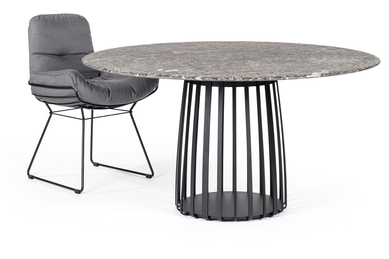 Janua BC 07 Basket Outdoor Tisch mit runder Steinplatte und schwarzem Metallgestell, dazu ein Stuhl.