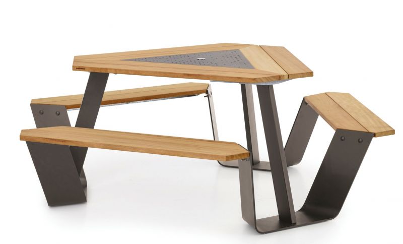 BB 11 Clamp Outdoor Tisch von Janua aus Akazie mit Bank und Stühlen.