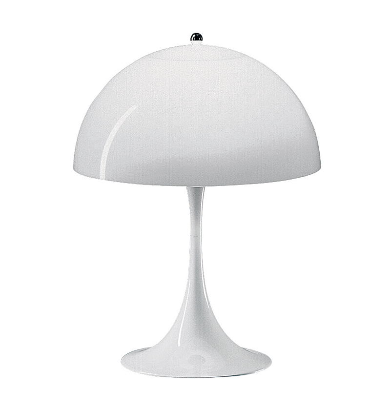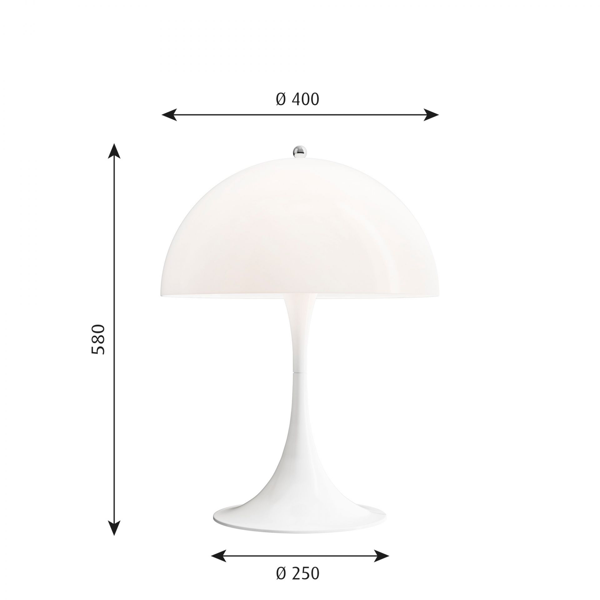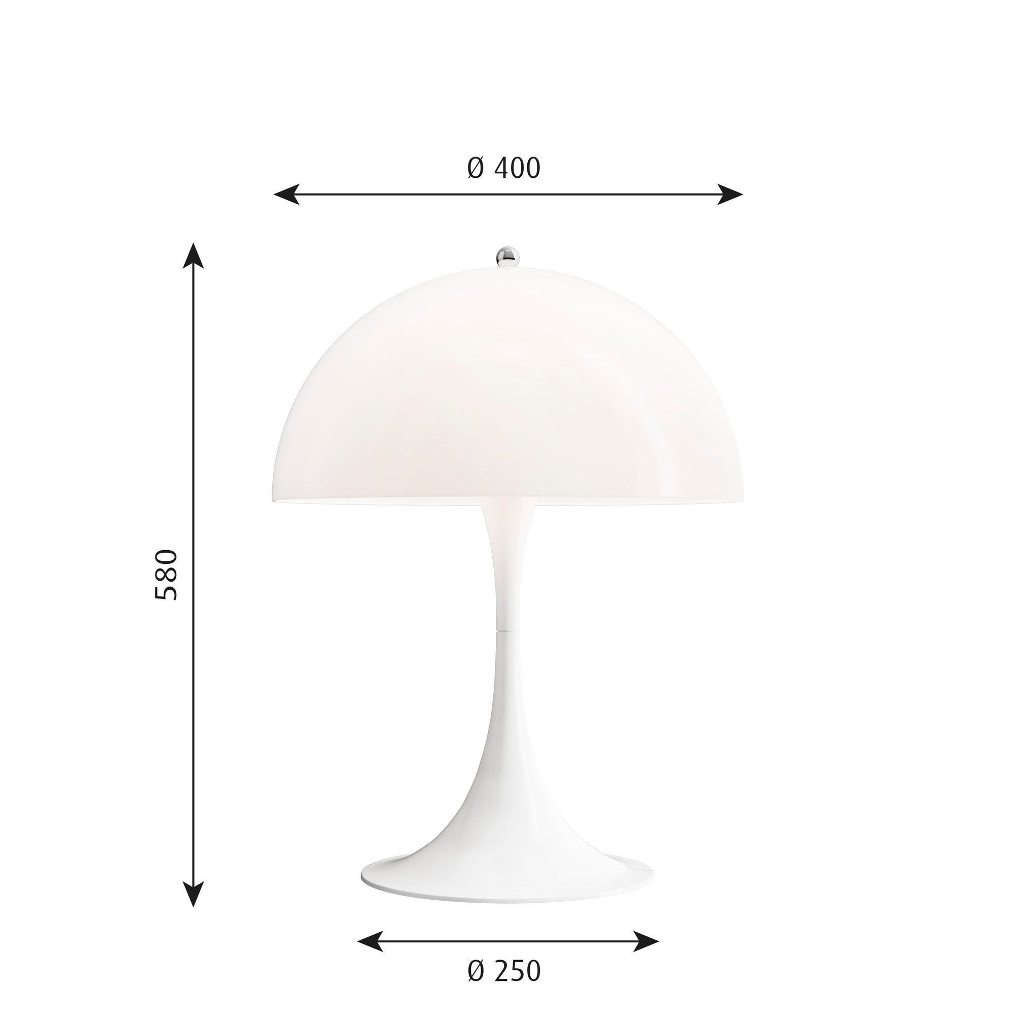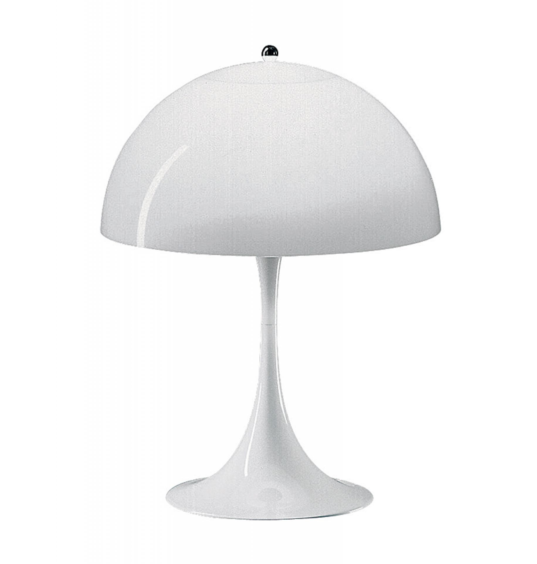 Die Panthella Tischleuchte zeichnet sich durch ihre harmonische ruhende Form aus. Der halbkreisförmige Schirm sorgt für ein weiches, angenehmes Licht. Er ist durchscheinend und strahlt das Licht von seiner Innenseite nach unten ab, sodass es vom trompetenförmigen Stab der Leuchte reflektiert wird.