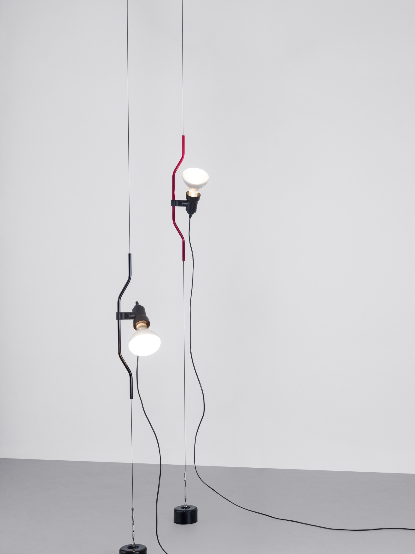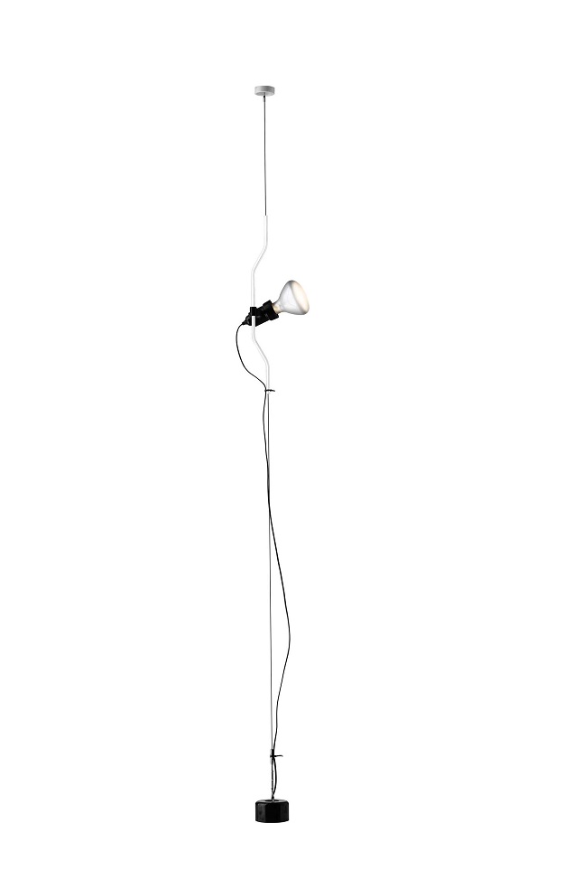 Höhenregulierung des Leuchtkörpers möglich durch Gleiten eines geformten, flüssig-lackiertem oder vernickelten Stahlrohr auf einem Stahlseil, das von der Decke bis zum Boden in voller Raumhöhe gespannt wird. Leuchtenkopf aus schwarzem, spritzgegossenem Elastomer mit eingebautem Bedienungsschalter. Elektrokabel, Nutzlänge 400 cm, Nettogewicht 3 kg. Die Leuchte verfügt über einen Dimmer.