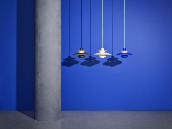 Das Modell PH 5 Mini Monochrome Pendelleuchte gehört zur 30 Modelle umfassenden Serie mit dreiteiligem Schirm, von denen drei Außenleuchten sind.
