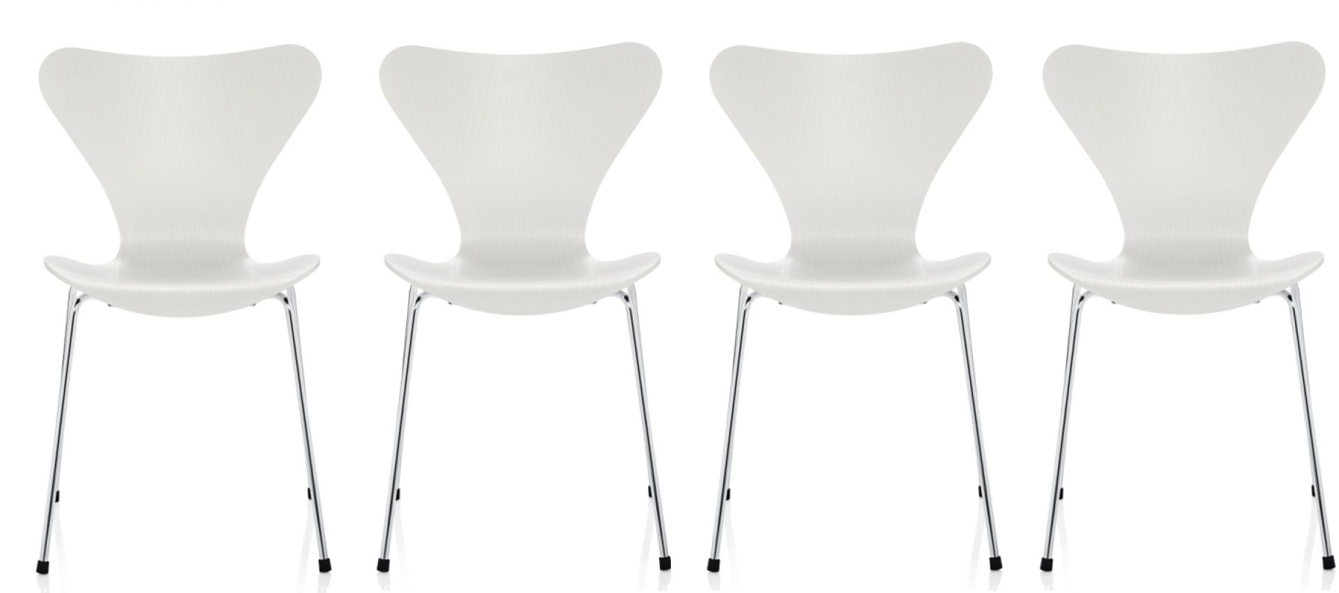 Das ist der Designer Stuhl 3107 der Serie 7 von Fritz Hansen, von Designer Arne Jacobsen auch Siebener Stuhl genannt. Das Revolutionäre am Siebener Stuhl war zu seiner Entstehungszeit 1955 die bei der Herstellung eingesetzte Technik der Schichtverleimung. Diese wurde in den 20er und 30er Jahren von Soeren C. Hansen perfektioniert – dies ist der Enkelsohn des Firmengründers Fritz Hansen