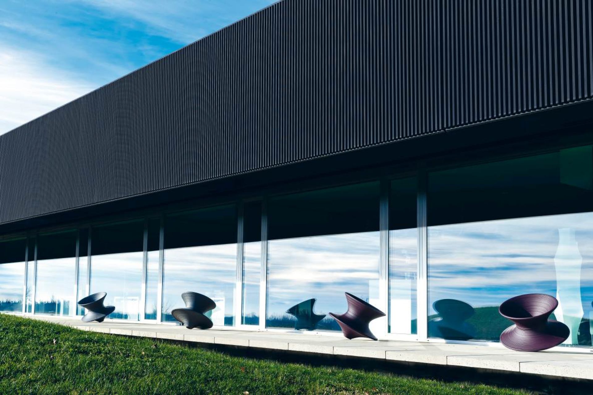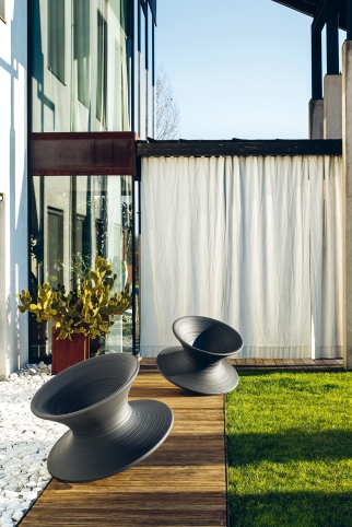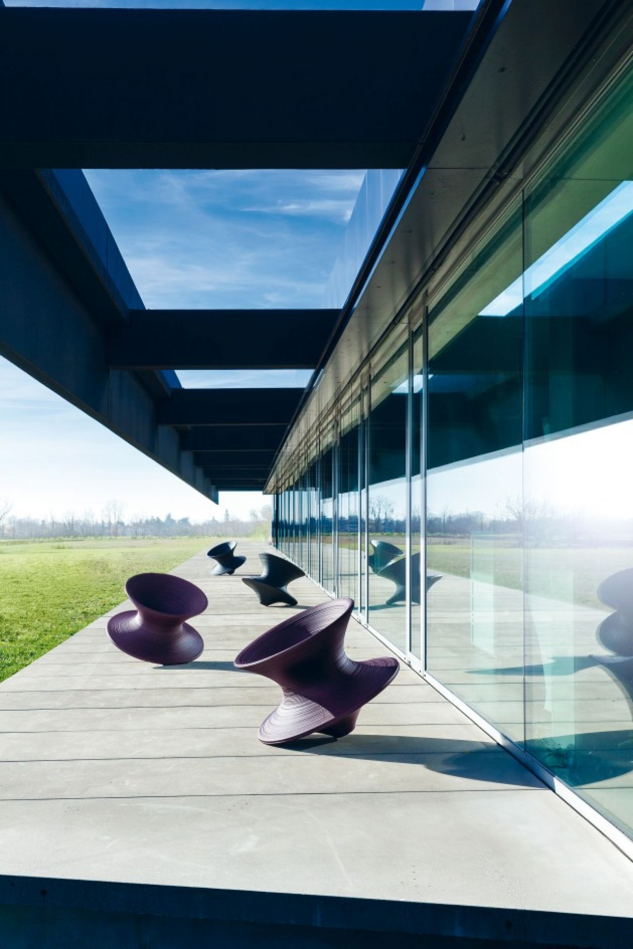 Absolut unkonventionell – der Spun Sessel von Magis kann auch als rotierender Kreiselsessel bezeichnet werden. Er erlaubt es, dass man sich in kreisförmigen Schaukelbewegungen dreht. Der funktionale und absolut ausgefallene Stuhl besteht aus einem einzigen Profil. Aus dem statischen skulpturalen Stück wird ein spielerisches Design.
