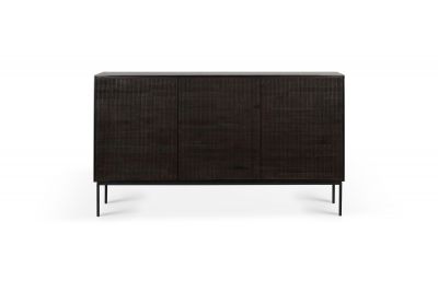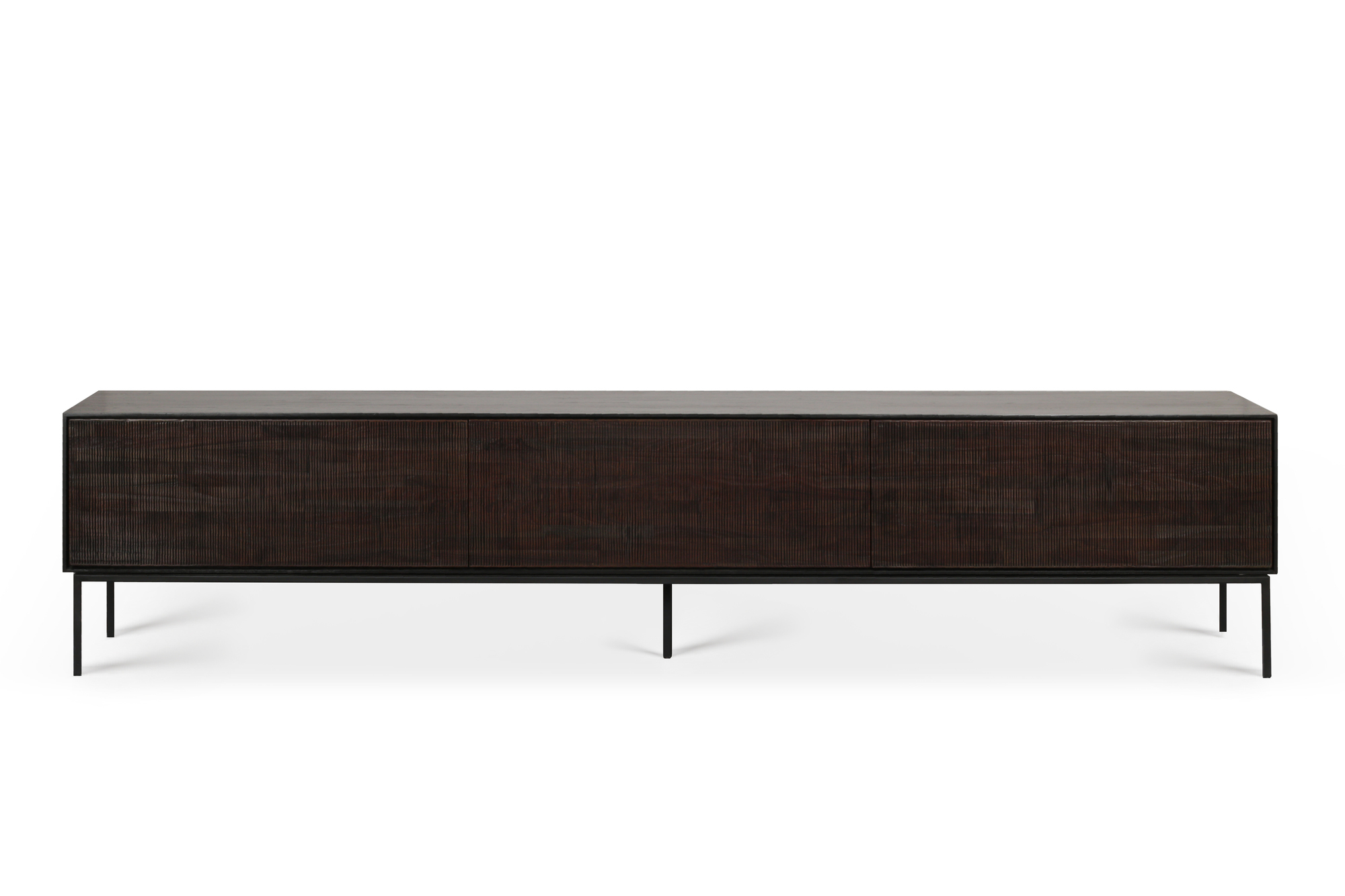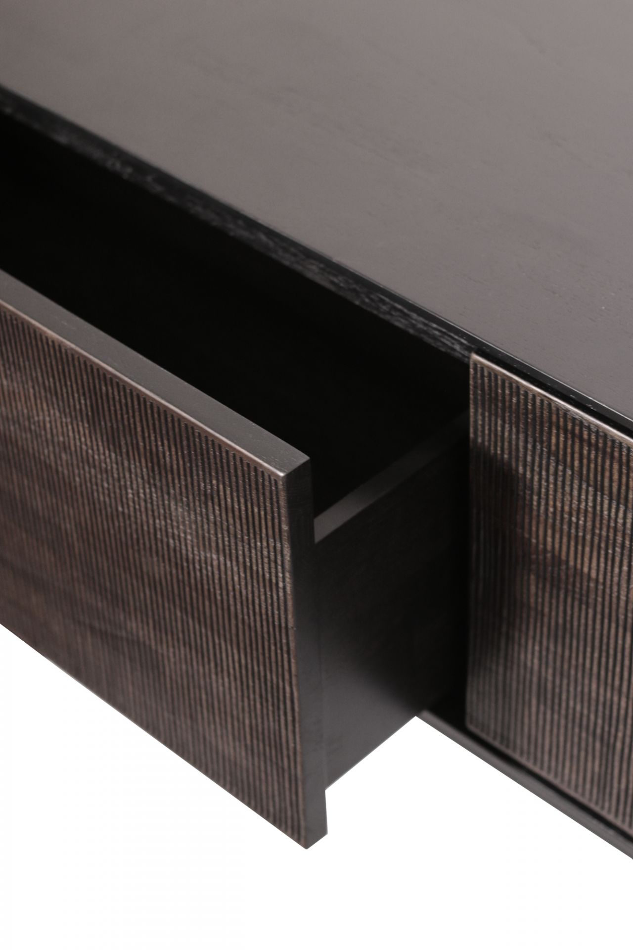 Das Sideboard verfügt je nach Auswahl über eine Flip Down Tür und ein oder zwei Schubladen. Es wird aus dunkel gefärbtem massivem Teakholz mit Lackierung und schwarzen Metallbeinen gefertigt. Es ist 45 cm tief und 53 cm hoch. Je nach Auswahl misst es in der Breite 162 oder 242 cm.