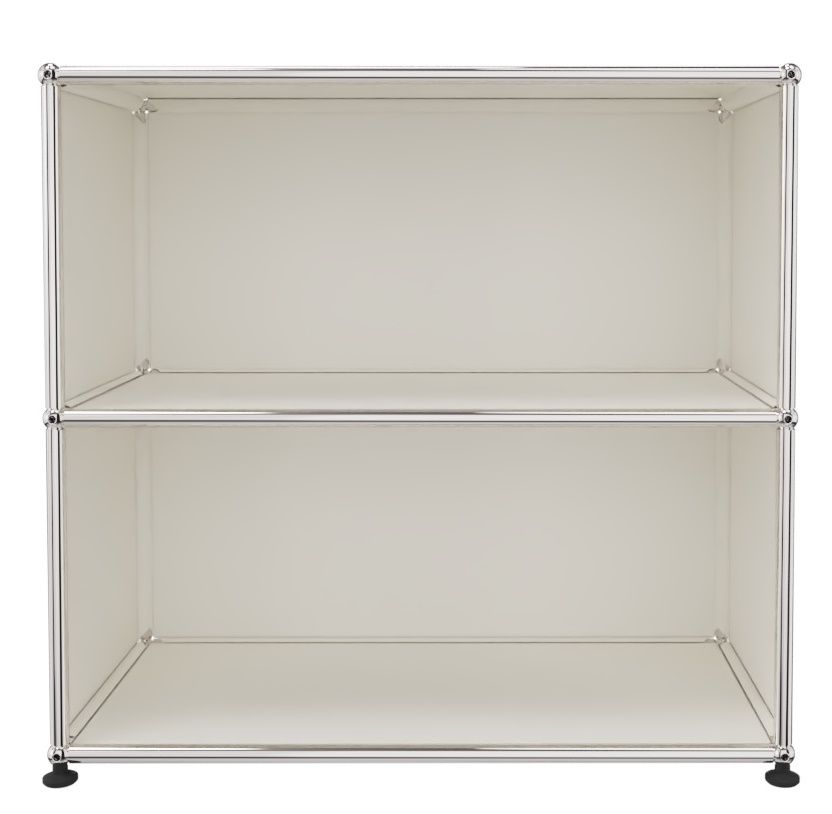 Die Möbel von USM Haller bestehen aus pulverbeschichtetem und verchromtem Metall. Das Regal verfügt über zwei Fächer. Es ist 75 cm breit, 35 cm tief und 75 cm hoch.